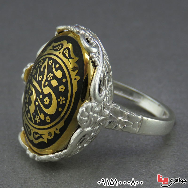 نقره 925 عیار - نگین انگشتر حدید طلایی با ذکر حسبی الله - انگشتری زیبا و مجلسی مناسب بانوان شیک پسند - (خواص حدید : حفظ جان از شر دشمنان ، ایمنی از آزار اذیت مردم ، رفع چشم زخم ، دفع بلا ، محافظت در برابر طلسم و جادو ، تقویت تمرکز و ... ) - نگین این انگشتر حدید، معدنی اصلی میباشد - نگین انگشتر با تراش بیضی - وزن: حدود 8/5 گرم - سری: 1400819/29**M S:1