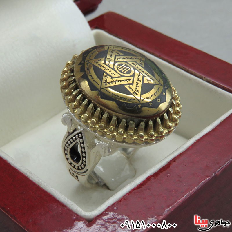 نقره 925 عیار - انگشتر حدید طلایی درشت و سنگین با نقش ستاره سلیمان با خواص : 1- افزایش ثروت و برکت 2- از بین برنده سحر و جادو 3- رفع حوائج مهم 4- برگرداندن معشوق و .... - انگشتری زیبا مناسب آقایان خاص پسند - (خواص حدید : حفظ جان از شر دشمنان ، ایمنی از آزار اذیت مردم ، رفع چشم زخم ، دفع بلا ، محافظت در برابر طلسم و جادو ، تقویت تمرکز و ... ) - نگین این انگشتر حدید، معدنی اصلی میباشد - نگین انگشتر با تراش بیضی - وزن: حدود 17/7 گرم - سری: 14020126/5**B S:0