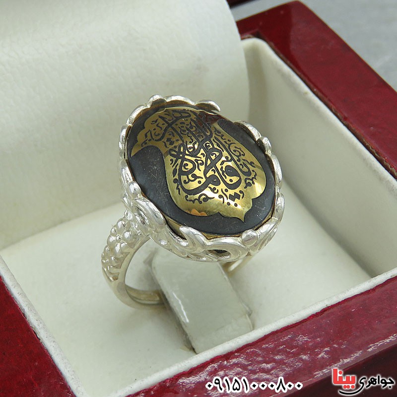 نقره 925 عیار - نگین انگشتر حدید طلایی با نقش یا فاطمه الزهرا - انگشتری زیبا مناسب بانوان خاص پسند - (خواص حدید : حفظ جان از شر دشمنان ، ایمنی از آزار اذیت مردم ، رفع چشم زخم ، دفع بلا ، محافظت در برابر طلسم و جادو ، تقویت تمرکز و ... ) - نگین این انگشتر حدید، معدنی اصلی میباشد - نگین انگشتر با تراش بیضی - وزن: حدود 8/8 گرم - سری: 14020109/6**M S:1