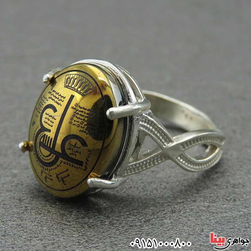 نقره 925 عیار - نگین انگشتر حدید طلایی با نقش زیبا عین علی - انگشتری زیبا مناسب بانوان خاص پسند - (خواص حدید : حفظ جان از شر دشمنان ، ایمنی از آزار اذیت مردم ، رفع چشم زخم ، دفع بلا ، محافظت در برابر طلسم و جادو ، تقویت تمرکز و ... ) - خواص دعای عین علی : (رهایی از بند و زندان - حفظ سلامتی و امنیت در سفر - افزایش محبت میان زن و شوهر - گشایش بخت - درمان سردرد - افزایش ثروت - رفع افسردگی و غم شدید و ...) - نگین این انگشتر حدید، معدنی اصلی میباشد - نگین انگشتر با تراش بیضی - وزن: حدود 6/4 گرم - سری: 14010825/25**M S:1
