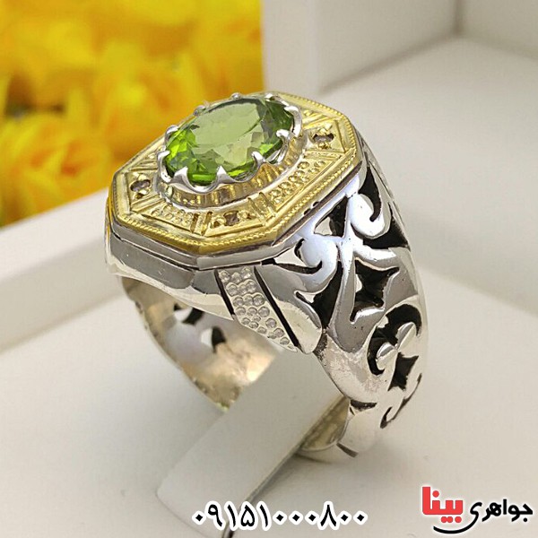 نقره 925 عیار - نگین انگشتر زبرجد بسیار خوشرنگ - انگشتر دست ساز دور برلیانی فاخر و باشکوه مناسب آقایان خوش سلیقه - (خواص زبرجد : از بین برنده غم ،افسردگی ،نفرت و حسادت - افزایش شانس و درآمد - تسکین دردهای استخوانی و ناراحتی های کبدی و ... ) - نگین این انگشتر زبرجد، معدنی اصلی میباشد - نگین انگشتر با تراش برلیانی - طرح روی رکاب شبکه ای و تاج برنجی می باشد - سری: 14010222/3**S S:1