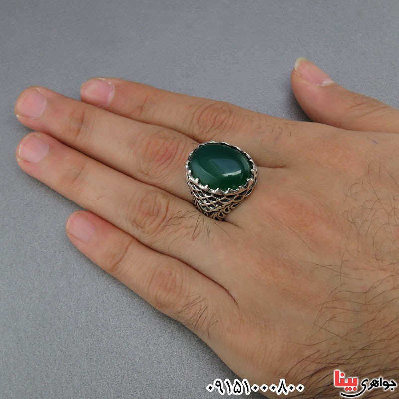 نقره 925 عیار - نگین انگشتر عقیق سبز خوشرنگ - انگشتر خوش ساخت و بادوام - ویژه آقایان خوش سلیقه - (خواص عقیق : افزایش رزق و روزی، دفع بلا، افزایش طول عمر و ... ) - نگین این انگشتر عقیق سبز، معدنی اصلی میباشد - نگین انگشتر با تراش بیضی - وزن: حدود 9/4 گرم - طرح روی رکاب پولکی می باشد - سری: 1400811/5**M S:1