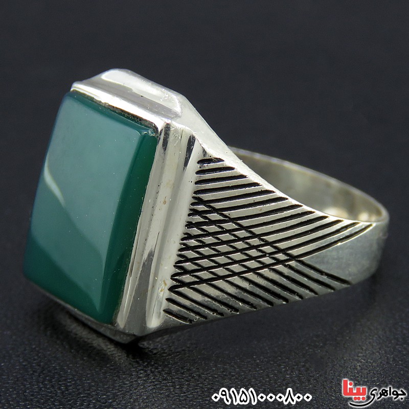 نقره 925 عیار - نگین انگشتر عقیق سبز خوشرنگ و زیبا - انگشتر پشت بسته همراه با حرز امام جواد - (خواص عقیق: افزایش رزق و روزی، دفع بلا، افزایش طول عمر، رفع غم و ...) - نگین این انگشتر عقیق سبز، معدنی اصلی میباشد - نگین انگشتر با تراش مستطیلی - وزن: حدود 6/8 گرم - طرح روی رکاب هاشوری سیاه قلم کاری شده می باشد - سری: 1400902/54**M S:1