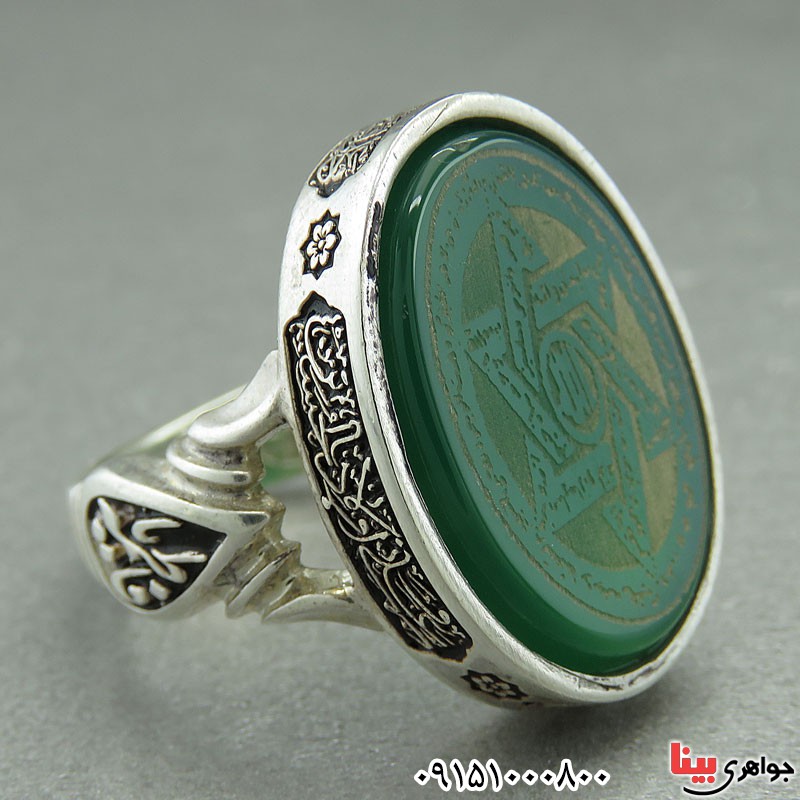 نقره 925 عیار - نگین انگشتر عقیق سبز فوق العاده زیبا و خوشرنگ با حکاکی ستاره سلیمان - انگشتر درشت و سنگین مناسب آقایان خاص پسند - (خواص عقیق : افزایش رزق و روزی ، دفع بلا ، افزایش طول عمر ، رفع غم و ... ) - به دلیل سفارشی بودن این کار بعد از ثبت سفارش,زمان ارسال حدودا 15 روز می باشد - نگین این انگشتر عقیق سبز، معدنی اصلی میباشد - نگین انگشتر با تراش بیضی - وزن: حدود 17/2 گرم - طرح روی رکاب یا علی ، یا فاطمه ، السلام علی الحسین می باشد - سری: 14011202/6**M S:0