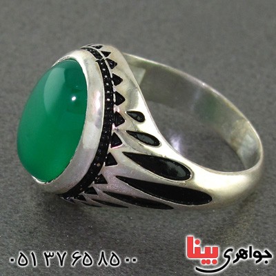 نقره 925 عیار - نگین انگشتر عقیق سبز خوشرنگ و عالی - انگشتری بادوام و با استحکام - مناسب آقایان خوش سلیقه - نگین این انگشتر عقیق سبز، معدنی اصلی میباشد - نگین انگشتر با تراش دامله - وزن: حدود 8 گرم - طرح روی رکاب اشکی سیاه قلم کاری شده می باشد - سری: 970126/11 S:0