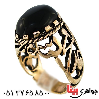 برنزی (طلا روسی) - نگین انگشتر اونیکس خوشرنگ و درشت - انگشتر برنزی (طلا روسی) درجه یک با درصد مس بالا به همراه سنگ مرغوب و اصلی که بنا به تقاضای متعدد مشتریان، نمونه اصلی و با کیفیت آن تهیه و در سایت قرار گرفته است - انگشتر با طرح سنتی و زیرخاکی - ساخت کمپانی الماس (ALMAS) یکی از بهترین برندهای ایرانی برنزی زیورآلات - روی رکاب انگشتر با خطی خوش "محمد رسول الله" شبکه کاری شده است - انگشتری جدید به سبک مد روز - ویژه آقایان خوش سلیقه و جوان پسند - نگین این انگشتر عقیق سیاه (اونیکس)، معدنی اصلی میباشد - نگین انگشتر با تراش دامله - طرح روی رکاب محمد رسول الله (ص) می باشد - سبک برنزی (طلا روسی) - سری: 940805 S:0