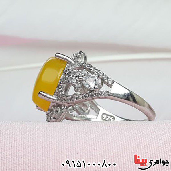 نقره 925 عیار - نگین این انگشتر عقیق شرف الشمس، معدنی اصلی میباشد - نگین انگشتر با تراش بیضی - وزن: حدود 4/8 گرم - طرح فریم تزئین شده با نگین های درخشان می باشد - سری: 31002/34*.. S:1
