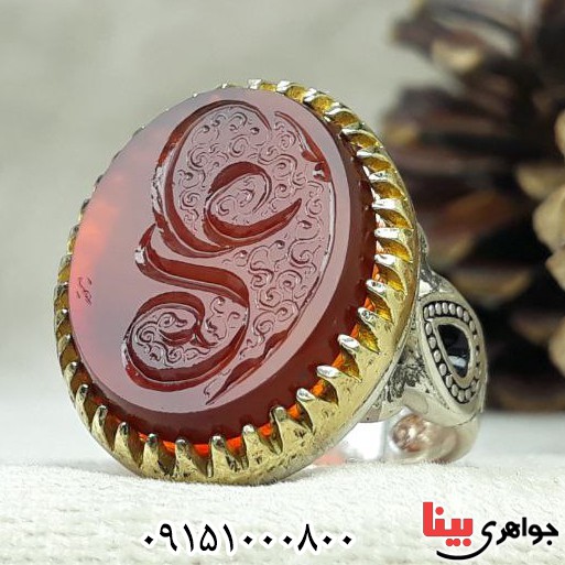 انگشتر عقیق قرمز خطی درشت با حکاکی علی زیبا و خاص _کد:32798