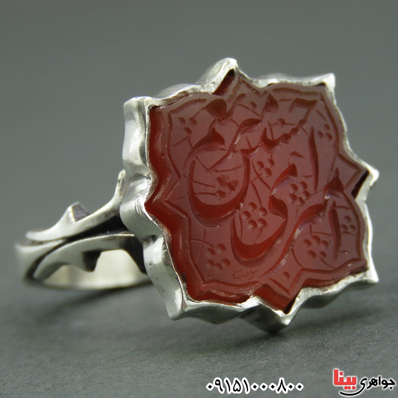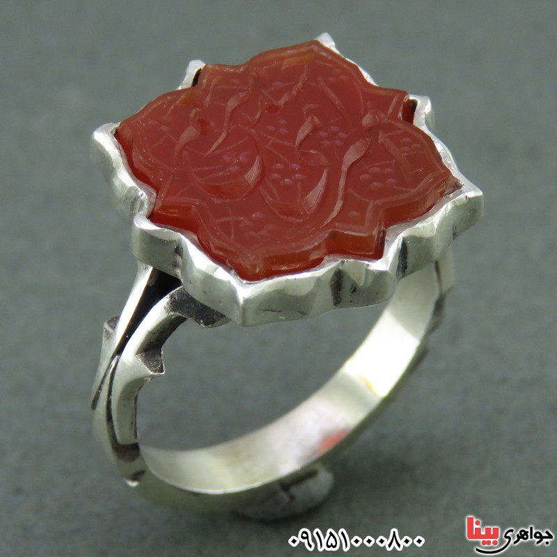 انگشتر عقیق قرمز خوشرنگ خاص مردانه با حکاکی امیری حسین و نعم ... _کد:25557