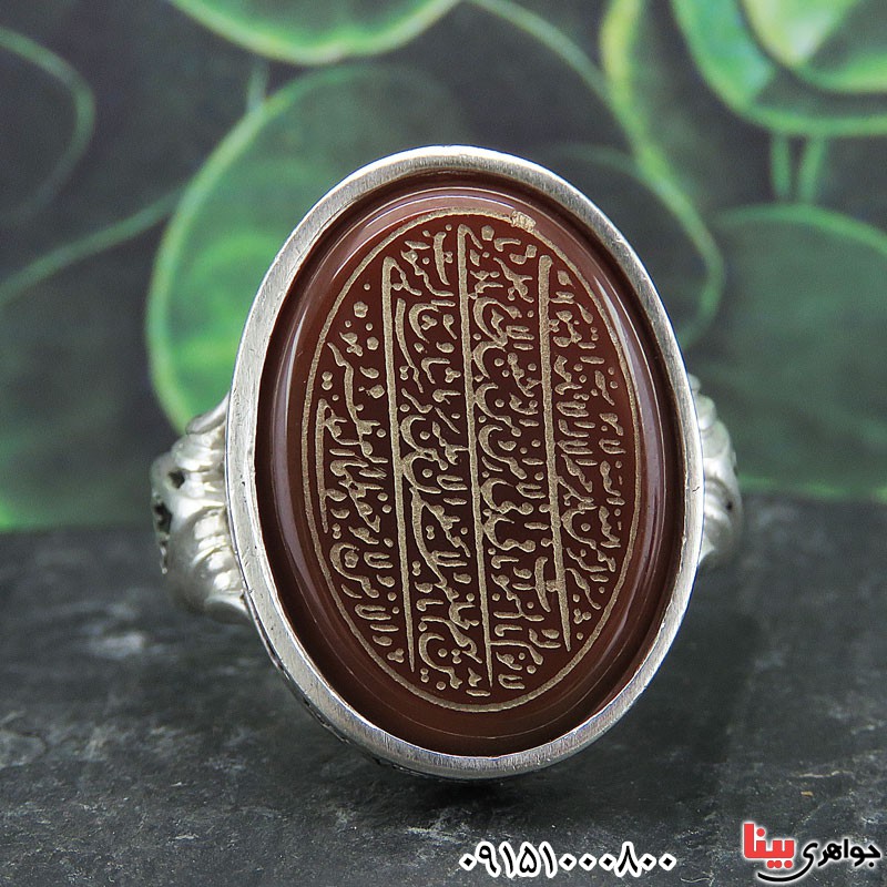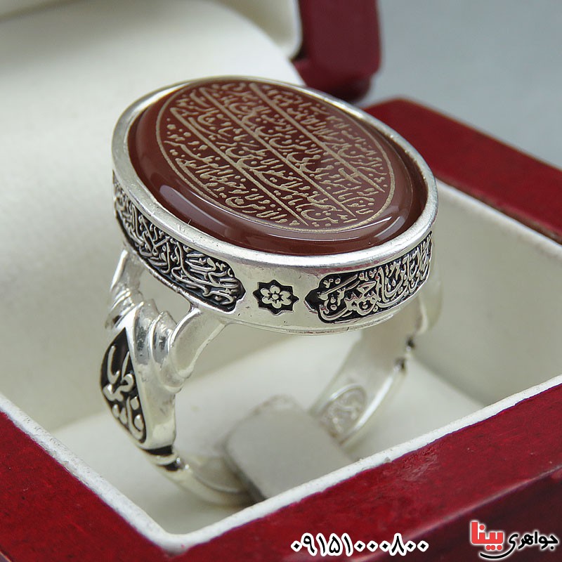 نقره 925 عیار - نگین انگشتر عقیق قرمز فوق العاده زیبا و خوشرنگ با حکاکی آیت الکرسی - انگشتر درشت و سنگین مناسب آقایان خاص پسند - (خواص عقیق : افزایش رزق و روزی ، دفع بلا ، افزایش طول عمر ، رفع غم و ... ) - به دلیل سفارشی بودن این کار بعد از ثبت سفارش,زمان ارسال حدودا 15 روز می باشد - نگین این انگشتر عقیق قرمز، معدنی اصلی میباشد - نگین انگشتر با تراش بیضی - وزن: حدود 17/2 گرم - طرح روی رکاب یا علی ، یا فاطمه ، السلام علی الحسین می باشد - سری: 14011202/9**M S:1