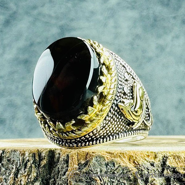 نقره 925 عیار - نگین این انگشتر عقیق یمنی، معدنی اصلی میباشد - نگین انگشتر با تراش بیضی - وزن: حدود 12/6 گرم - طرح روی رکاب تاج برنجی، قلم زنی می باشد - سری: 31009/11*3 S:1