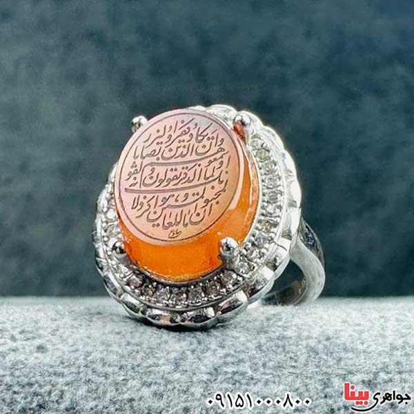 نقره 925 عیار - نگین انگشتر عقیق یمنی خطی فوق العاده زیبا و خوشرنگ با حکاکی و ان یکاد - مناسب بانوان خاص پسند - (خواص عقیق : افزایش رزق و روزی ، دفع بلا ، افزایش طول عمر ، رفع غم و ... ) - روکش رودیوم - نگین این انگشتر عقیق یمنی، معدنی اصلی میباشد - نگین انگشتر با تراش بیضی - وزن: حدود 6/5 گرم - سری: 14030627/7*3 S:1