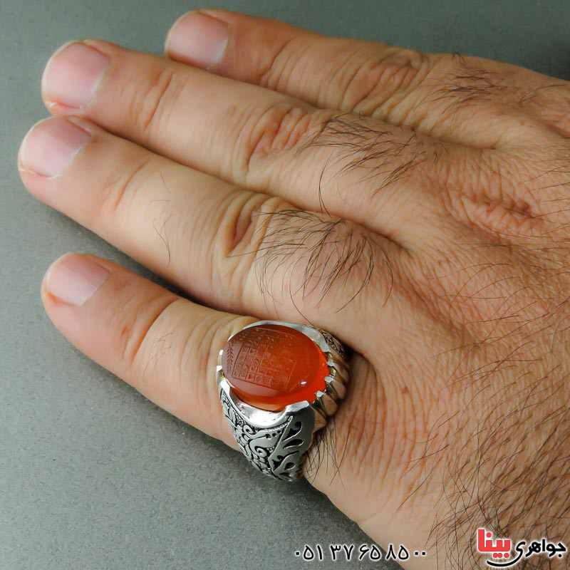 نقره 925 عیار - نگین انگشتر عقیق یمنی خاص و بسیار زیبا - انگشتری شیک مناسب آقایان خاص پسند - (خواص عقیق : افزایش رزق و روزی ، دفع بلا ، افزایش طول عمر ، رفع غم و ... ) - انگشتری خطی دست ساز و زیبا - انگشتر با حکاکی آیه هفت شرف - نگین این انگشتر عقیق یمنی، معدنی اصلی میباشد - نگین انگشتر با تراش بیضی - وزن: حدود 20/3 گرم - طرح روی رکاب اسلیمی و قلم زنی می باشد - سری: 1400208/7 S:0