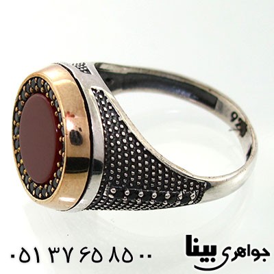 نقره 925 عیار - نگین عقیق قرمز خوشرنگ و خوش تراش صاف - انگشتر خوش ساخت با طرح سنتی - طرح سیاه قلم - رکاب انگشتر با ساختی زیبا به صورت بیضی و دور طلایی ساخته شده است - رکاب انگشتر شیک، ضخیم و با دوام - انگشتری درشت و سنگین - انگشتر مدلی خاص که نگین های ریز اونیکس در دور نگین عقیق باعث جلوه انگشتر شده است - انگشتر مورد پسند آقایان خوش سلیقه - انگشتر عقیق قرمز مردانه - وزن: حدود 12-11 گرم. سری: 940130. t