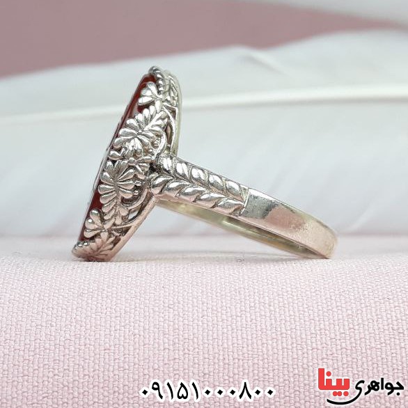 نقره 925 عیار - نگین انگشتر عقیق پرتقالی بسیار خوشرنگ و خاص - انگشتر زنانه زیبا با حکاکی یا حی یا قیوم - (خواص عقیق: افزایش رزق و روزی، دفع بلا، افزایش طول عمر، رفع غم و ...) - نگین این انگشتر عقیق، معدنی اصلی میباشد - نگین انگشتر با تراش بیضی - وزن: حدود 4/6 گرم - سری: 14030725/36*.. S:1