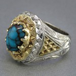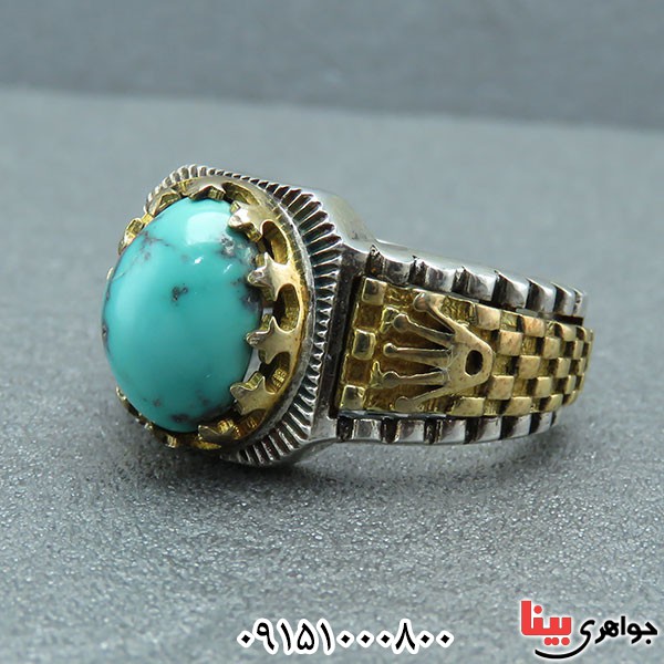 نقره 925 عیار - نگین انگشتر فیروزه نیشابوری خوشرنگ - انگشتر دست ساز، درشت و سنگین - رکاب با پرداخت و جلای عالی - انگشتری فاخر و هنری مورد پسند آقایان خوش سلیقه و مشکل پسند میباشد - (خواص فیروزه: دفع چشم زخم - افزایش درآمد - بچه دار شدن - محافظت در برابر حوادث و بلایا و ... ) - نگین این انگشتر فیروزه، معدنی اصلی میباشد - نگین انگشتر با تراش دامله - وزن: حدود 11/2 گرم - طرح روی رکاب رولکسی می باشد - سری: 14030814/2*3 S:1