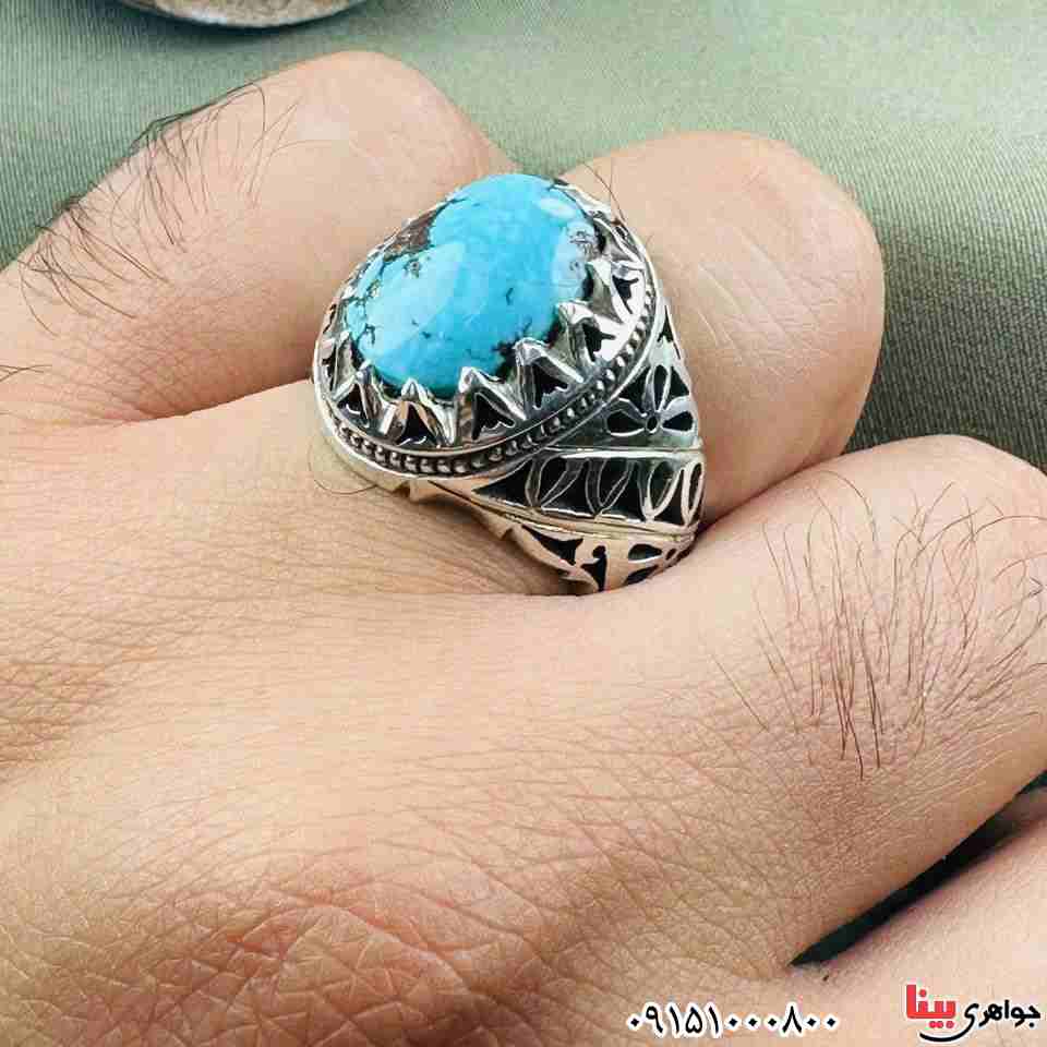 نقره 925 عیار - انگشتر دست ساز فیروزه نیشابوری خوشرنگ درشت و سنگین - انگشتری فاخر و لوکس مورد پسند آقایان خوش سلیقه -(خواص فیروزه: دفع چشم زخم - افزایش درآمد - بچه دار شدن - محافظت در برابر حوادث و بلایا و ... ) - نگین این انگشتر فیروزه، معدنی اصلی میباشد - نگین انگشتر با تراش بیضی - وزن: حدود 15/3 گرم - طرح روی رکاب شبکه کاری می باشد - سری: 14030705/48*3 S:0