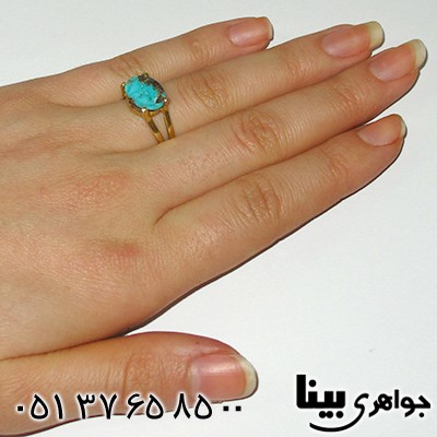 نقره 925 عیار - روکش آب طلا - نگین فیروزه نیشابوری خوشرنگ با شجرهای زیبا - نگین فیروزه نیشابوری خوش تراش - انگشتر دست ساز - سبک زیر خاکی - انگشتری جدید، خاص و زیبا - انگشتر فیروزه نیشابوری زنانه. سری: 940116. t