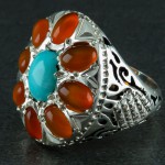 نقره 925 عیار - نگین فیروزه نیشابوری عجمی فوق العاده زیبا در مرکز و نگین های عقیق یمنی خوشرنگ دور آن به زیبایی ست شده است - انگشتر نه نگین با نگین های با کیفیت بسیار عالی - انگشتر دست و ساز درشت - نگین این انگشتر چند جواهر، معدنی اصلی میباشد - با استفاده از این انگشتر از خواص این دو سنگ همزمان بهره ببرید - نگین انگشتر با تراش دامله - وزن: حدود 11 گرم - طرح روی رکاب اسلیمی و آینه کاری می باشد - سری: 991020/45**SA S:1