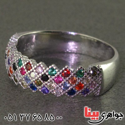 نقره 925 عیار - انگشتر نقره زنانه طرح پرنسس - درخشش این حلقه مانند طلای سفید می باشد - حلقه ای شیک و زیبا، مخصوص بانوان خوش سلیقه - این انگشتر دارای آبکاری رودیوم (طلاسفید) است که علاوه بر جلوه زیبا و براقی که به محصول میبخشد، باعث جلوگیری از سیاه شدن نقره میشود - روکش رودیوم - وزن: حدود 5 گرم - طرح فریم مزین به نگین های درخشان سوئیسی رنگی می باشد - سری: 970515/29 S:3