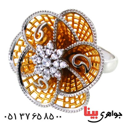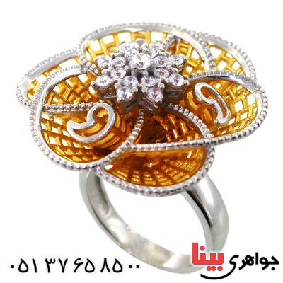 نقره 925 عیار - انگشتر نقره درشت مدل گل - انگشتری شیک و جدید - مناسب بانوان زیباپسند - انگشتری مجلسی و باشکوه، درشت و سنگین - با این انگشتر خاص و منحصر به فرد در مهمانی ها بدرخشید - ردیفی از نگین های کریستالی در وسط این انگشتر به زیبایی تزیین شده و آن را درخشان کرده است - انگشتر نقره درجه یک با آب کاری عالی و نگین های کریستال اتریش و بلژیکی اصل - روکش رودیوم و آب طلا - وزن: حدود 11-12 گرم - سبک رودیوم - سری: 950519 S:1