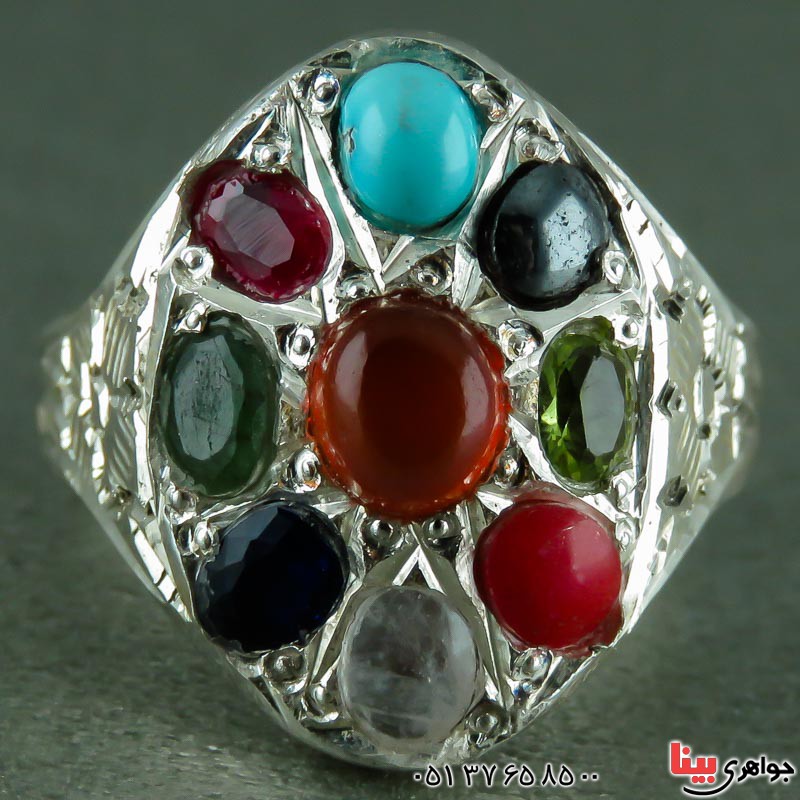 نقره 925 عیار - نگین عقیق یمنی زیبا و خوشرنگ در مرکز و نگین های فیروزه نیشابوری ، حدید ، زمرد ، یاقوت کبود ، یاقوت سرخ ، زبرجد ، مرجان و در نجف دور آن به زیبایی ست شده است - انگشتر نه نگین با نگین های با کیفیت و خاص - با استفاده از این انگشتر از خواص چندین سنگ همزمان بهره ببرید - انگشتری دست ساز مناسب افراد خاص پسند - نگین این انگشتر چند جواهر، معدنی اصلی میباشد - وزن: حدود 3/7 گرم - سری: 1400209/3 S:0