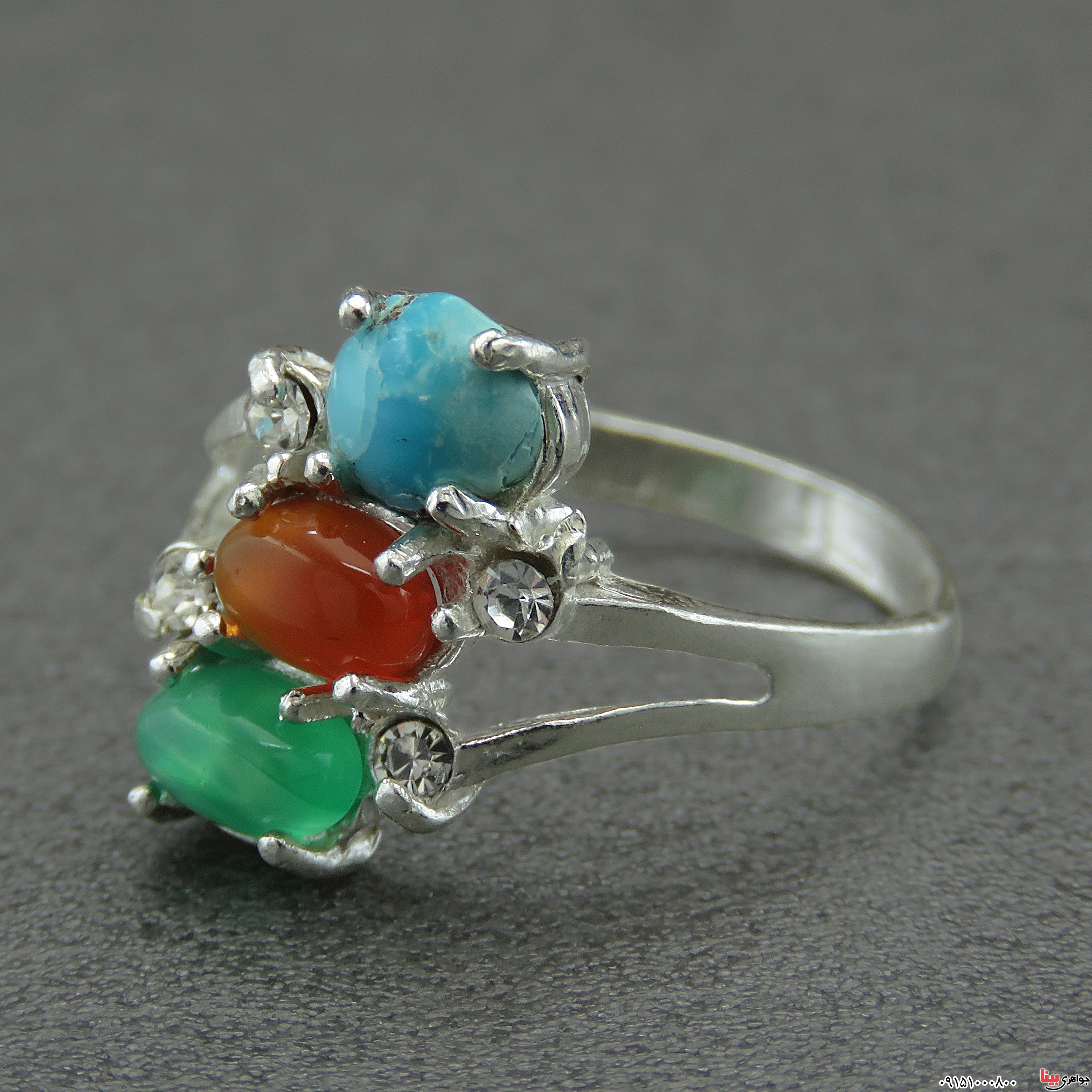 نقره 925 عیار - انگشتر چندجواهر شامل نگین های عقیق یمنی ، فیروزه نیشابوری و عقیق سبز خوشرنگ - با خرید این سبک کار از خواص انواع نگین های آن بهره ببرید و مثل مولتی ویتامین چندین خواص دارد - انگشتر مناسب بانوان خاص پسند - نگین این انگشتر چند جواهر، معدنی اصلی میباشد - نگین انگشتر با تراش دامله - سری: 14010827/3 S:5