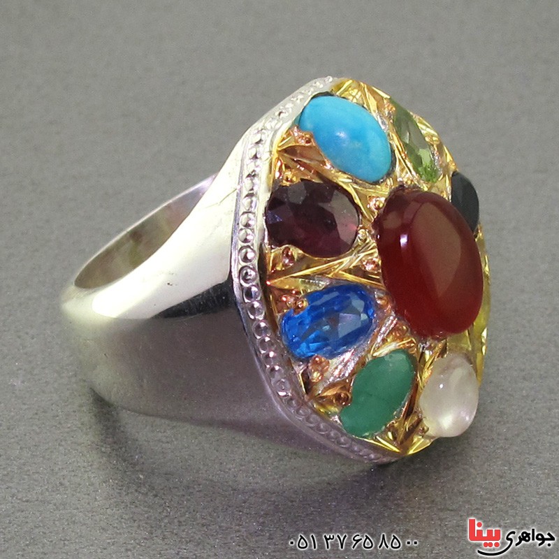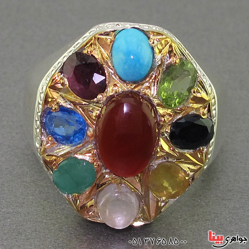 نقره 925 عیار - انگشتر چندجواهر شامل نگین های عقیق یمنی، فیروزه نیشابوری ، زمرد، زبرجد ، یاقوت کبود ، یاقوت سرخ ، توپاز ، سیترین - کارگاه تخصصی جواهری بینا با استادکاران ماهر و چیره دست سفارش ساخت انگشتر و گردنبند با هر نوع سنگی به صورت سفارشی و تکی می پذیرد - با توجه به سنگ های مختلف این کارها تک و خاص میشوند و فقط بنا به سفارش ساخته می شود . در گذر زمان به علت تک، خاص و با کیفیت بودن قیمتی تر می شود - نگین این انگشتر چند جواهر، معدنی اصلی میباشد - سری: 981126 S:1