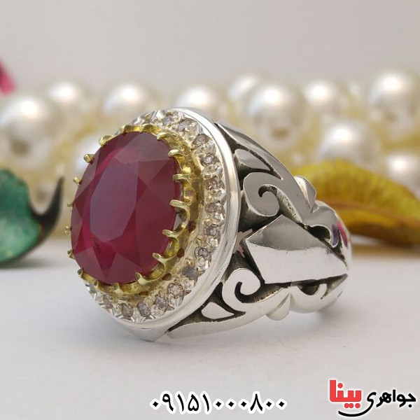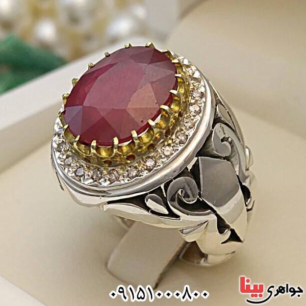 انگشتر یاقوت سرخ دور برلیان دست ساز مردانه _کد:28136