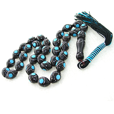 تسبیح کشکول (کوک) ۳۳ دانه ای نقره کوب و مرصع کاری فیروزه مصری که فیروزه با رنگ مشکی خیلی زیبا شده
