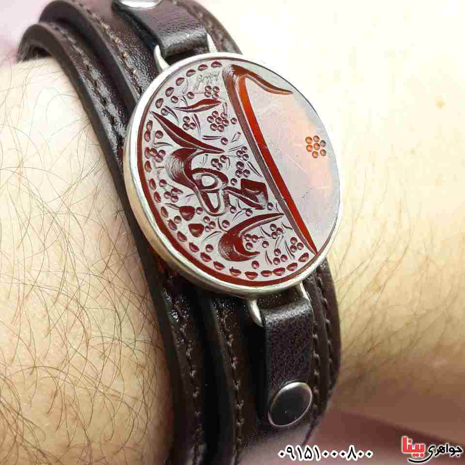 نقره 925 عیار - دستبند چرم درجه یک با نگین عقیق سرخ خطی خوشرنگ با قاب نقره دست ساز - با حکاکی یا مهدی - دستبند مد روز و جوان پسند مناسب همه سلیقه ها - (خواص عقیق : افزایش رزق و روزی، دفع بلا، افزایش طول عمر و ... ) - تراش نگین بیضی می باشد - نگین این دستبند، معدنی اصلی میباشد - سری: 14030513/48*..