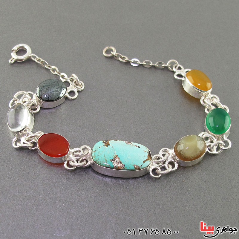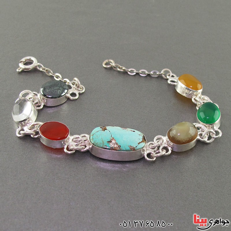 نقره 925 عیار - دستبند نقره شامل نگین های فیروزه نیشابوری، عقیق باباقوری ، عقیق سبز ، عقیق شرف الشمس ، عقیق قرمز ، درنجف و حدید با حکاکی دعای هفت جلاله باکیفیت - مناسب سنگ درمانی - کاری اصیل، سنتی و دست ساز - با توجه به اصالت کار و زیبایی آن با این دستبند در مهمانی ها خاص باشید - ویژه بانوان خاص پسند - نگین های این دستبند چند جواهر، معدنی اصلی میباشد - با خرید این سبک کار از خواص انواع نگین های آن بهره ببرید و مثل مولتی ویتامین چندین خواص دارد - وزن: حدود 12 گرم - سری: 981207/4