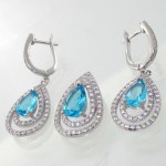 نقره 925 عیار - روکش آب طلا - نگین های توپاز خوشرنگ و شفاف اشکی شکل با تراش برلیانی - سرویس با طراحی خاص و جدید - این سرویس جذابیت شما را در مهمانی ها بیشتر میکند - این سرویس شامل گردنبند و گوشواره می باشد - سرویس سنگین که با درخشش نگین های توپاز در کنار نگین های اتمی سوئیسی بسیار به چشم می آید. 931102. t