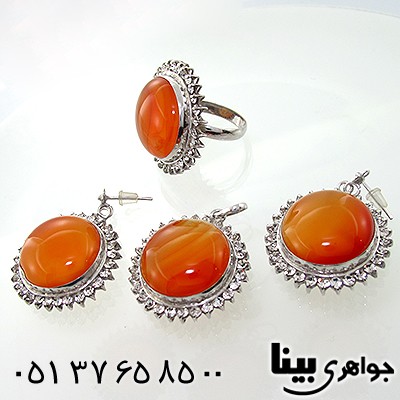 نقره 925 عیار - روکش آب طلای دو لایه - نگین های سرویس، عقیق سلیمانی خوشرنگ و خوش نقش - طرح های هاله ای زیبایی در دل نگین عقیق نمایان است - سرویس دست ساز - کار دست اساتید مجرب جواهری بینا - سبک سنتی - سرویسی درشت و سنگین - نگین های اتمی سوئیسی مدل شمسه دور نگین عقیق باعث جلوه و درخشش سرویس شده است - سرویس شامل گردنبند، انگشتر و گوشواره می باشد - سرویسی زیبا ویژه خانم های مشکل پسند - مناسب جهت ست کردن با لباس در مهمانی های باشکوه - کاری فاخر که فقط یک نمونه از آن ساخته شده است - سرویس عقیق زنانه - وزن: حدود 42 گرم - سری: 940125. t