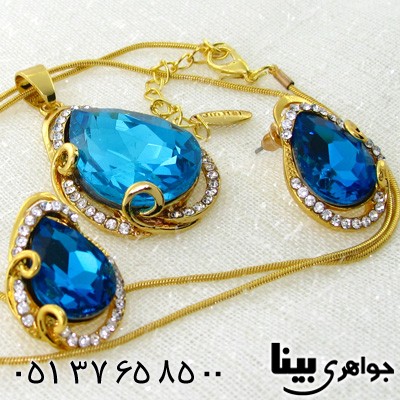 تیتانیوم (بدلیجات) طرح آب طلا زرد - نگین های آبی خوشرنگ، درشت و شفاف با تراش برلیانی - نگین های اتمی که دور نگین آبی قرار گرفته باعث درخشش کار شده است - مدل طراحی این سرویس به صورت اشکی شکل می باشد - این سرویس شامل گردنبند همراه بازنجیر و گوشواره می باشد - سرویسی جذاب که با نگین های درخشنده آن صاحب یک سرویس زیبا شوید. سری: 931102. t