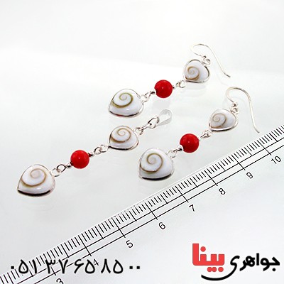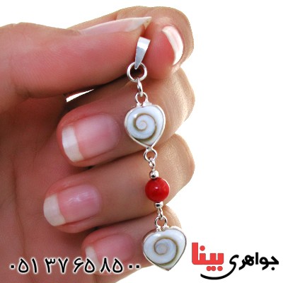 نقره 925 عیار - صدف مهره مار - صدف های تراش داده شده - کار اصیل و سنتی - کاری شیک و جذاب - در قدیم به این نوع صدف مهره مار نیز می گفتند - دو نگین مهره مار و یک نگین مرجان به صورت آویز به زیبایی سرویس افزوده است - این سرویس شامل گردنبند و گوشواره می باشد - نگین این سرویس چند جواهر، معدنی اصلی میباشد - وزن: حدود 5-6 گرم - سبک سنتی - سری: 950609 S:0