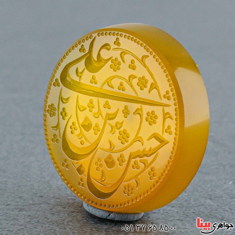 نگین عقیق زرد خراسانی خوشرنگ با حکاکی " حسن بن علی" دستی گود و هنری با امضاء استاد جواد - نگینی بسیار خاص و چشم نواز بسیار با ارزش - نگینی خاص ، چشم نواز و زیبا - قابل سفارش برای انواع زیور آلات : انگشتر و گردنبند و ... که سفارش ساخت آن توسط جواهری بینا پذیرفته می شود - نگین با تراش بیضی - (خواص عقیق : افزایش رزق و روزی، دفع بلا، افزایش طول عمر، رفع غم و ...) - نگین عقیق معدنی و اصلی می باشد - نگین درشت و سنگین و با وزن حدود : 23 قیراط - سری : 990709/23**D