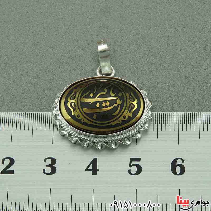نقره 925 عیار - نگین گردنبند حدید طلایی با حکاکی یا زینب کبری - گردنبند زیبا مناسب بانوان خاص پسند - (خواص حدید : حفظ جان از شر دشمنان ، ایمنی از آزار اذیت مردم ، رفع چشم زخم ، دفع بلا ، محافظت در برابر طلسم و جادو ، تقویت تمرکز و ... ) - نگین این گردنبند حدید، معدنی اصلی میباشد - نگین گردنبند با تراش بیضی - وزن: حدود 6/7 گرم - سری: 14010224/29**M S:1