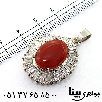 تیتانیوم - گردنبند با نگین عقیق قرمز با تراش بیضی و صاف - روکش رادیوم - نگین های باگت دور نگین عقیق قرمز این گردنبند باعث درخشش و جلوه کار شده است - گردنبندی زیبا و تک - نگین این گردنبند عقیق، معدنی اصلی میباشد - نگین گردنبند با تراش دامله - سری: 940228. t
