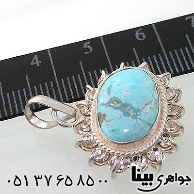 نقره 925 عیار - نگین فیروزه نیشابوری شجری بسیار خوشرنگ - گردنبندی دست ساز و سنتی - مدل گردنبند با تراش بیضی و دور جواهری که دور نگین فیروزه، نگین های سوئیسی ست شده است و باعث جلوه و درخشش گردنبند شده است - گردنبندی زیبا و شکیل - گردنبند فیروزه زنانه - سری 940116.t