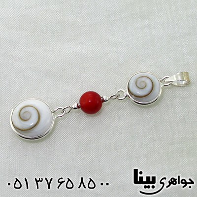 نقره 925 عیار - نگین های این گردنبند از صدف مهره مار و مرجان خوشرنگ تشگیل شده - کاری شیک و جذاب که هم زنانه است و هم مردانه - در قدیم به این نوع صدف مهره مار نیز می گفتند - گردنبندی آویز و زیبا. سری: 931116. t