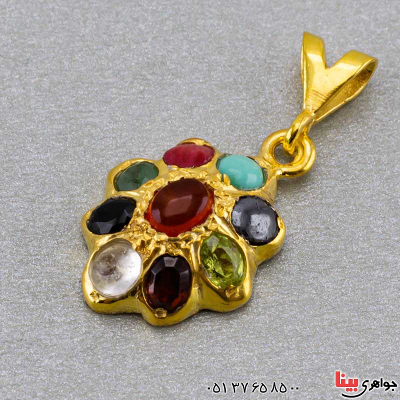 نقره 925 عیار - کارگاه تخصصی جواهری بینا با استادکاران ماهر و چیره دست سفارش ساخت انگشتر و گردنبند با هر نوع سنگی به صورت سفارشی و تکی می پذیرد - با توجه به سنگ های مختلف این کارها تک و خاص میشوند و فقط بنا به سفارش ساخته می شود . در گذر زمان به علت تک، خاص و با کیفیت بودن قیمتی تر می شود - نگین های گردنبند شامل یاقوت کبود ، یاقوت سرخ , یاقوت گارنت , فیروزه , زمرد , زبرجد , در نجف , حدید می باشد - با خرید این سبک کار از خواص همه ی این سنگ ها همزمان بهره ببرید - روکش آب طلا - نگین این گردنبند چند جواهر، معدنی اصلی میباشد - وزن: حدود 3-4 گرم - سری: 990422/8 S:2