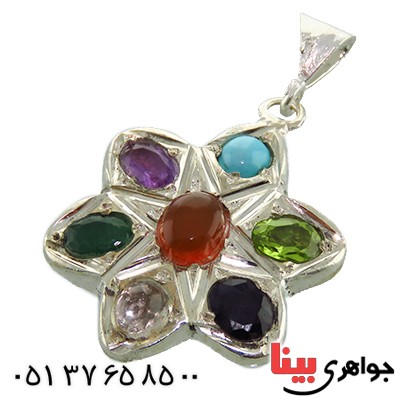 نقره 925 عیار - نگین عقیق یمنی خوشرنگ در وسط گردنبند و نگین های فیروزه عجمی، زمرد، یاقوت کبود، زبرجد، در نجف و آمتیست بسیار زیبا دور تا دور گردنبند چیده شده اند - طراحی گردنبند به شکل شش پر - گردنبند درشت دست ساز- دارای حرز امام جواد (ع) و تربت کربلا - از این محصول تعداد بالا موجود می باشد و به دلیل معدنی و طبیعی بودن سنگ ها، ممکن است نمونه ارسالی از لحاظ نوع سنگ، رنگ و نقوش کمی با تصویر متفاوت باشد - نگین این گردنبند چند جواهر، معدنی اصلی میباشد - وزن: حدود 6-7 گرم - سری: 960422 S:0