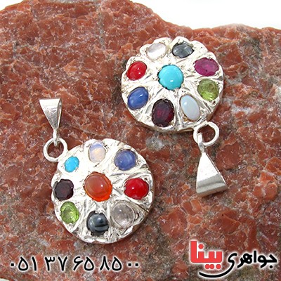 نقره 925 عیار - نگین های گردنبند شامل عقیق یمنی، فیروزه نیشابوری، اوپال، در نجف، حدید، زبرجد، یاقوت گارنت، فیروزه نیشابوری، یاقوت استار و یاقوت سرخ، مرجان - کار دست - سنتی - ساخت جواهری بینا - مخراج کاری بسیار دقیق و زیبا - با سنگ های شفاف و درجه یک - یک عدد گردنبند چند جواهر مشکل گشا به همراه زنجیر نقره، تسبیح آرامش، بخور، کتابچه دعا به همراه 350 حرز برگزیده از مفاتیح الجنان و ... - پشت گردنبند بسته و دارای حرز امام جواد(ع) می باشد -