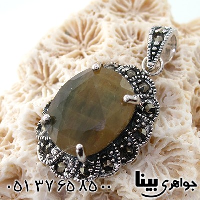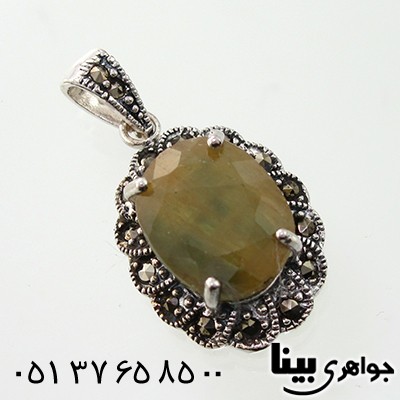 نقره 925 عیار - نگین یاقوت زرد خوشرنگ، درشت با تراش برلیانی - فریم گردنبند به سبک مارکازیتی حدید کاری شده است - مدل گردنبند زیبا و چشم نواز - مورد پسند خانم های خوش سلیقه - گردنبند یاقوت زرد مارکازیتی - نگین این گردنبند یاقوت زرد، معدنی اصلی میباشد - نگین گردنبند با تراش برلیانی - سبک مارکازیت حدید سنگ اصلی - سبک مارکازیت هانگ - سری: 940208. S:0