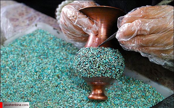 تزئین سنگ فیروزه بر روی ظرف هایی با پایه سیمین، نقره و یا برنجی صورت می گیرد.