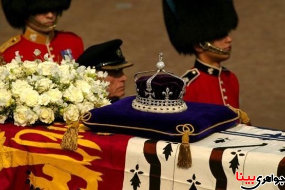 تاج ملکه مادر که بر روی تابوتش قرار دارد و در طول تشییع جنازهاش نمایش داده میشود