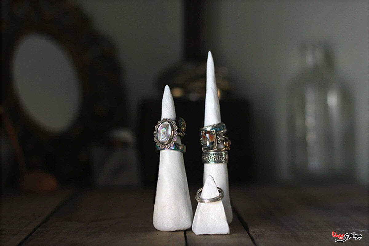 اگر اهل کاردستی و هنر در خانه هستید، میتوانید با گِل رُس چندین مخروط بزرگ و کوچک به شکل کلهقند بسازید. پس از خشک شدن آن ها را رنگ کنید و به عنوان جا انگشتری روی میز آرایش بگذارید.