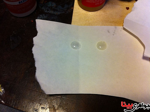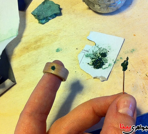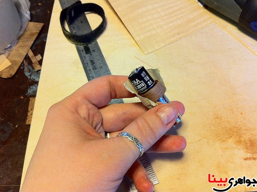 حالا مخلوط اپوکسی و چسب را با خلال دندان داخل سوراخهای روی انگشتر بریزید . کمیوازلین روی انگشت تان را بزنید و با آن روی روی سوراخها را صاف کنید . حواستان باشد که نباید خیلی داخل سوراخ را خالی کنید .