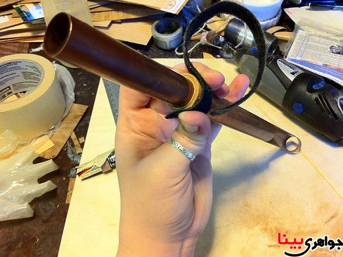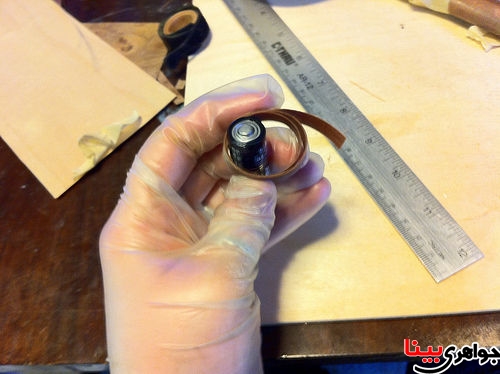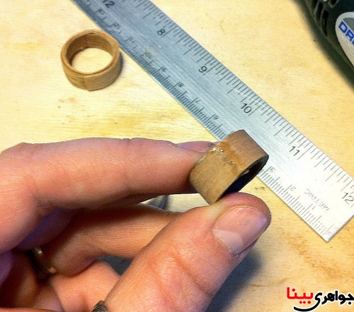 اگر میخواهید رنگ داخل و بیرون انگشترتان با هم فرق داشته باشد، در این مرحله فقط روکشی که برای داخل انگشتر انتخاب کرده اید را دور میله بپیچید . اگر هم میخواهید انگشتر چوبی تان سنگ داشته باشد، حواستان باشد که ابتدا قسمت یک تکه یا همان روکش پایه را دور میله بپیچید . اگر هم از روش اول برای بریدن نوارها اضافه کرده اید، نوارهای نازک روی انگشتر را کنار بگذارید برای بعد .